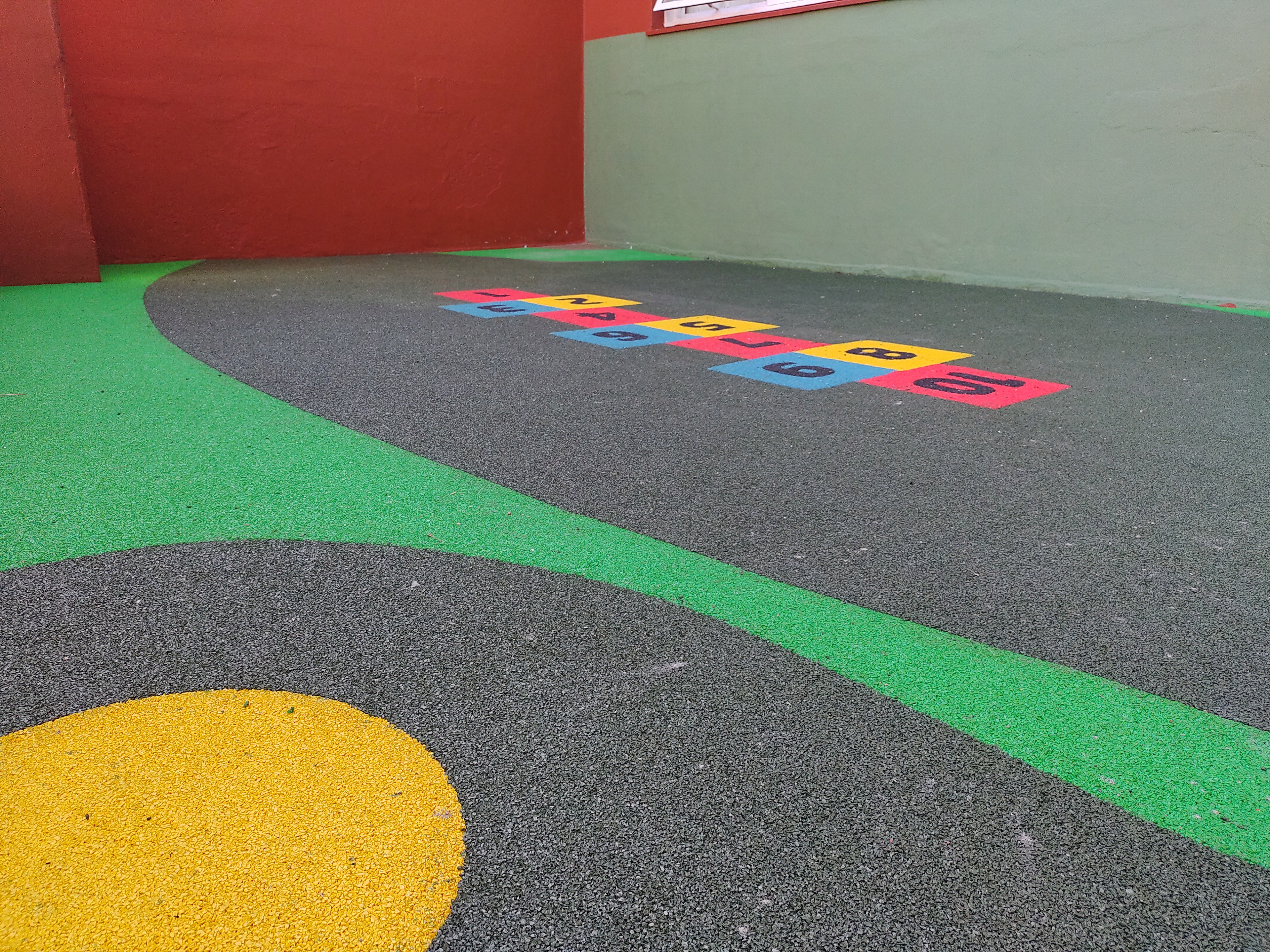 El nuevo diseño incorporó múltiples juegos 2D sobre la superficie, convirtiendo al piso en un elemento activo de la experiencia lúdica. De esta forma, no solo protege frente a caídas, sino que también invita a la imaginación y al movimiento.