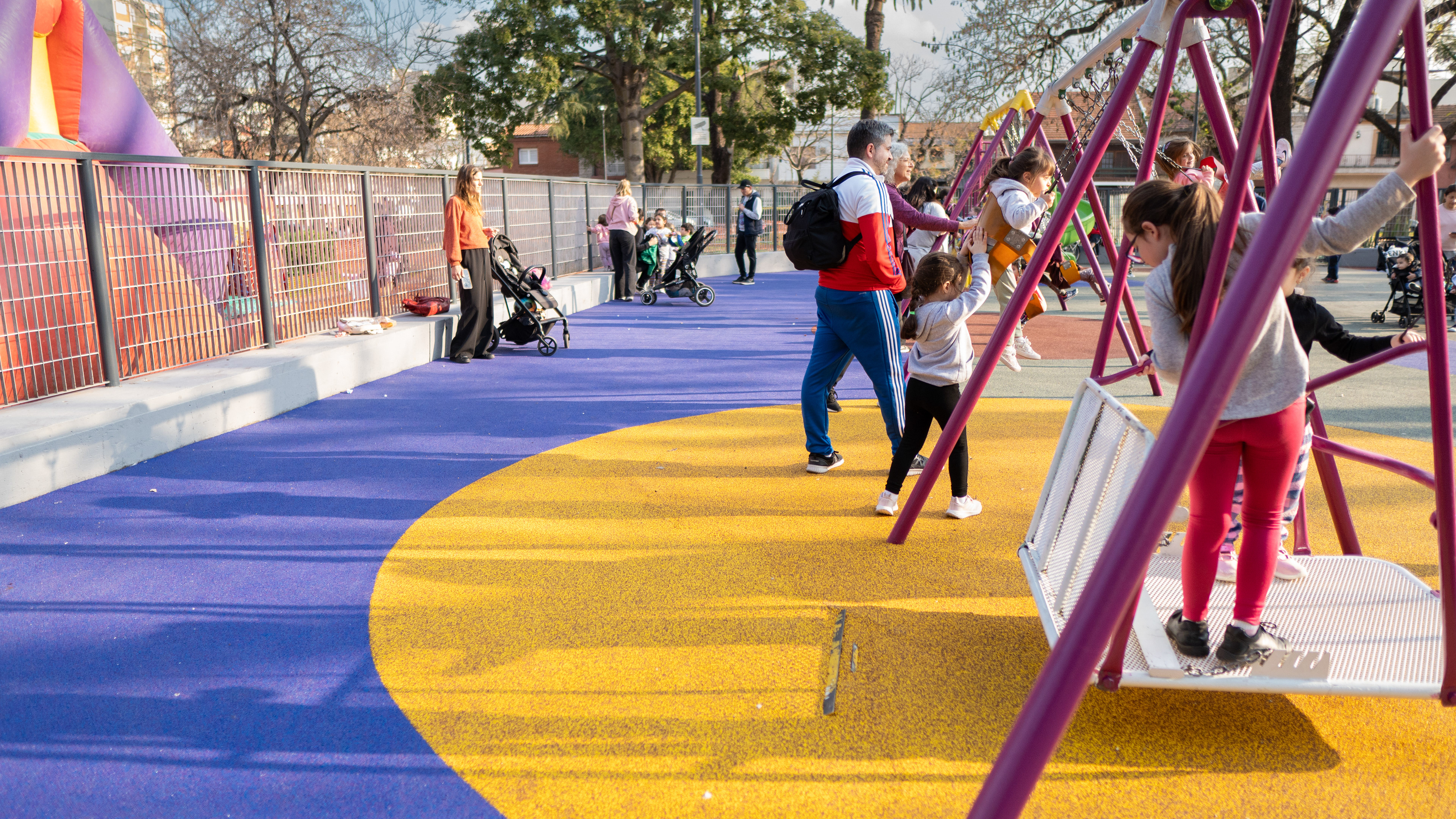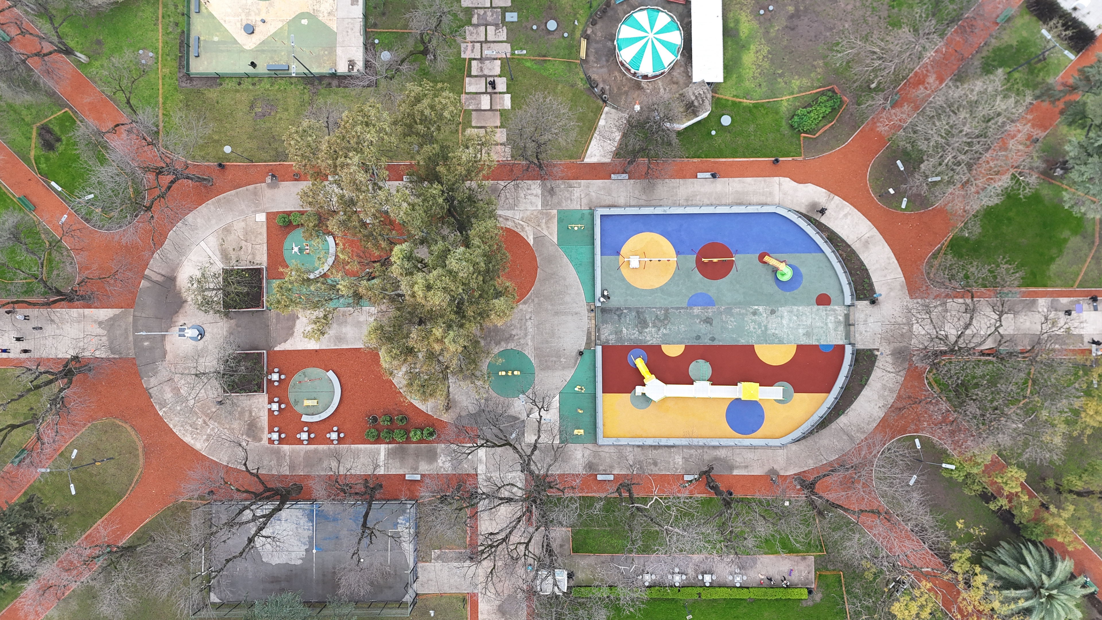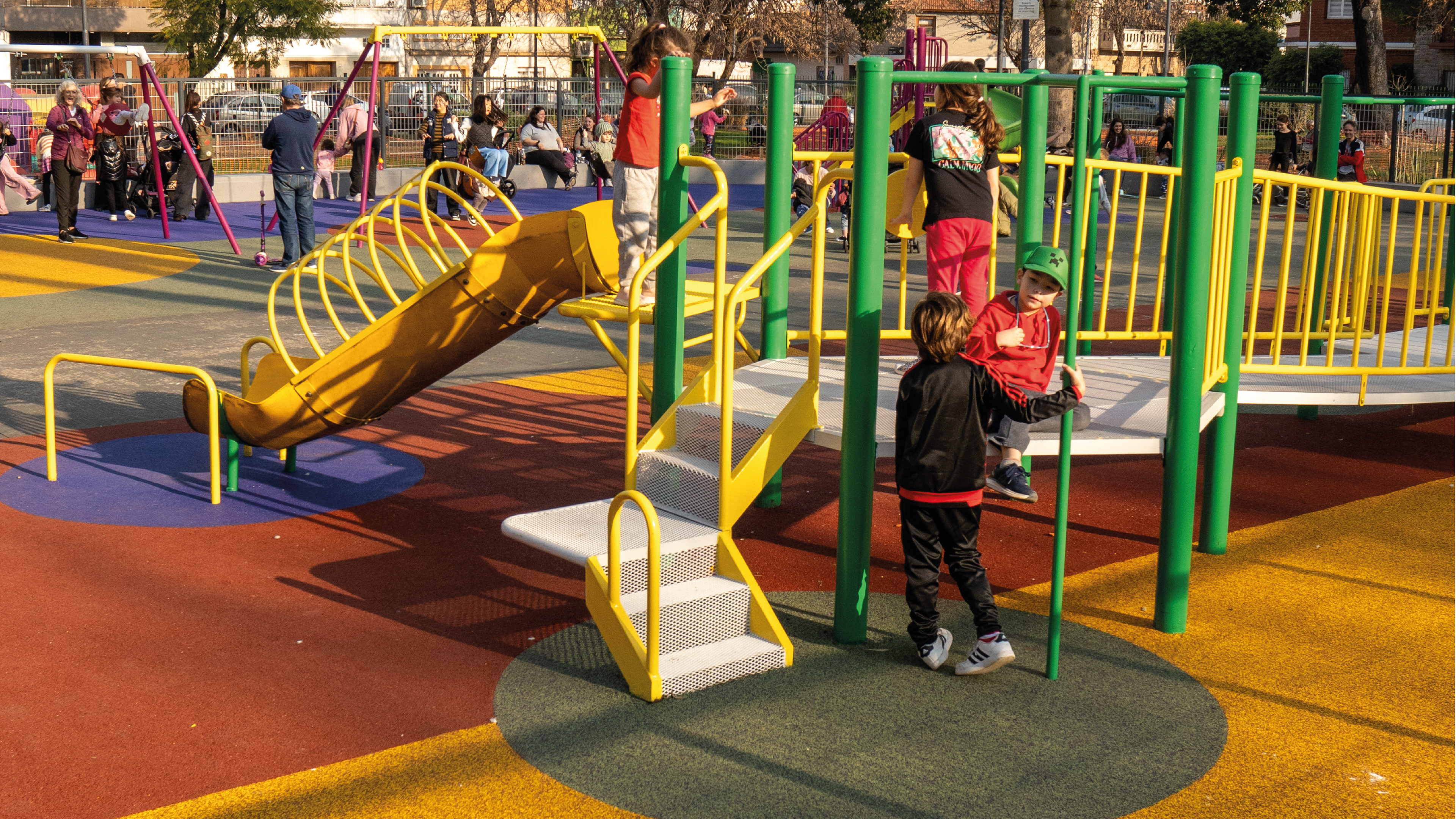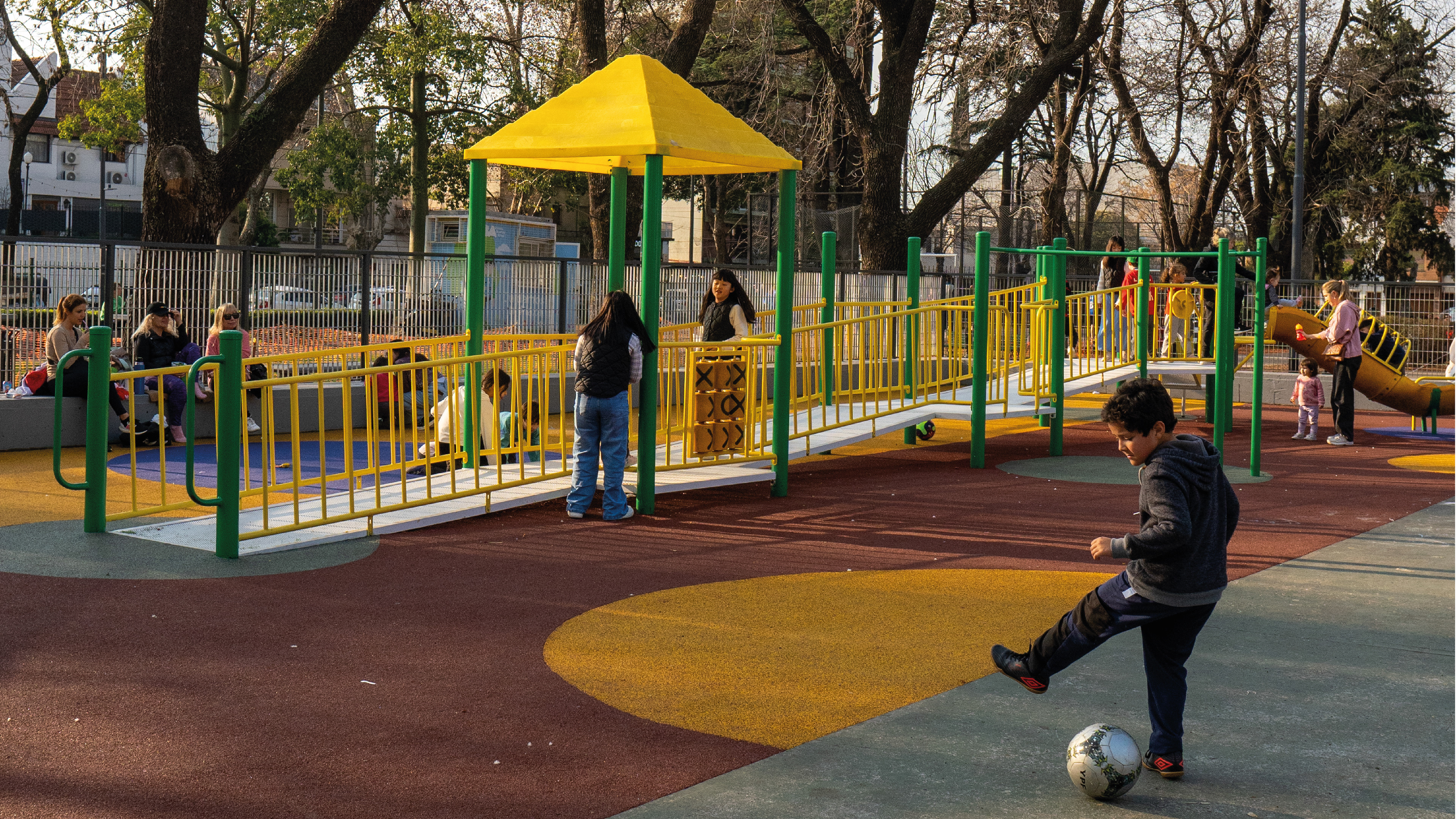Se puso en valor el equipamiento inclusivo existente a través de tareas de pintura, mantenimiento y recambio de hamacas, reforzando su accesibilidad y calidad. Además, se integró el sendero central de hormigón al área lúdica mediante un diseño con pintura epoxi, que conecta y ordena los recorridos del espacio.