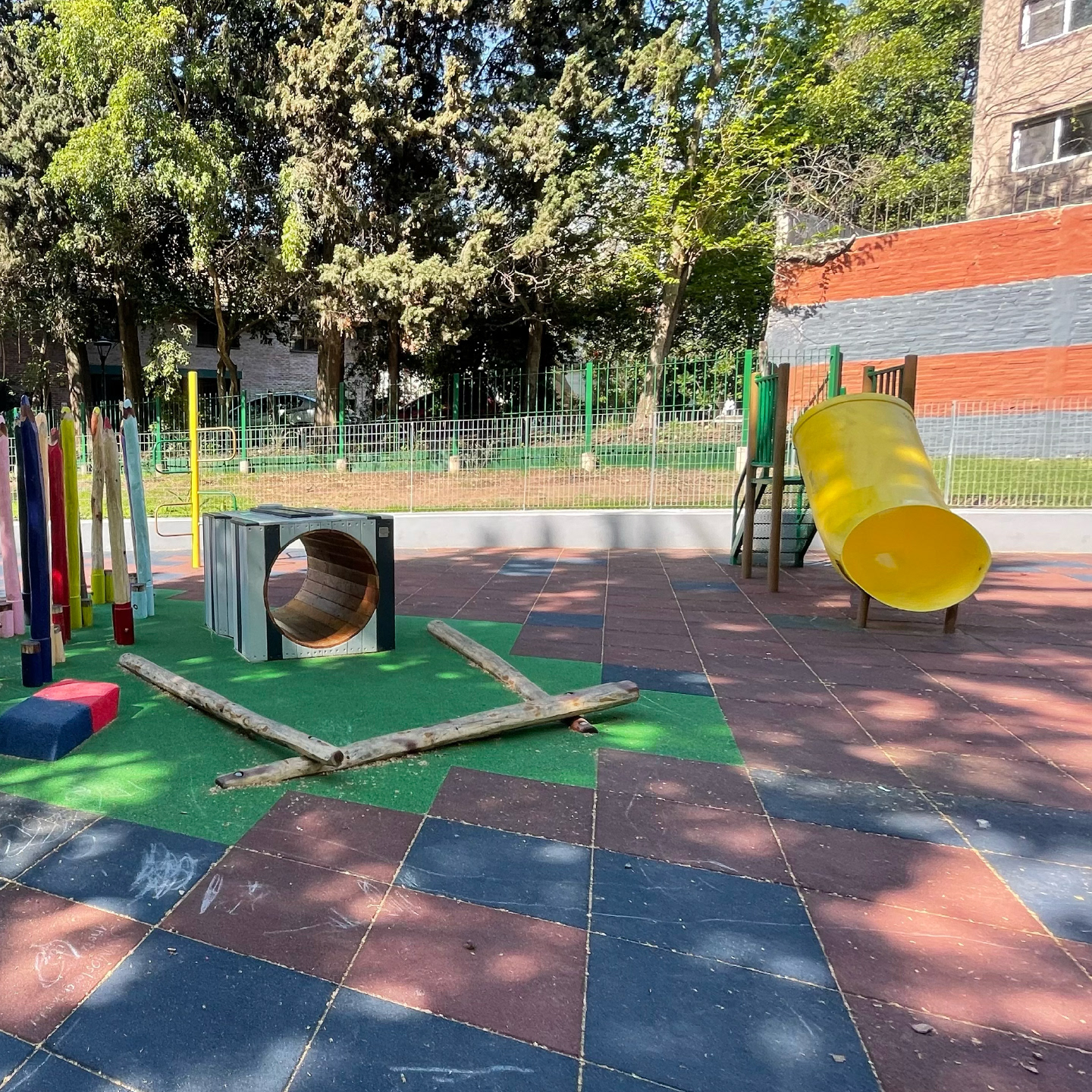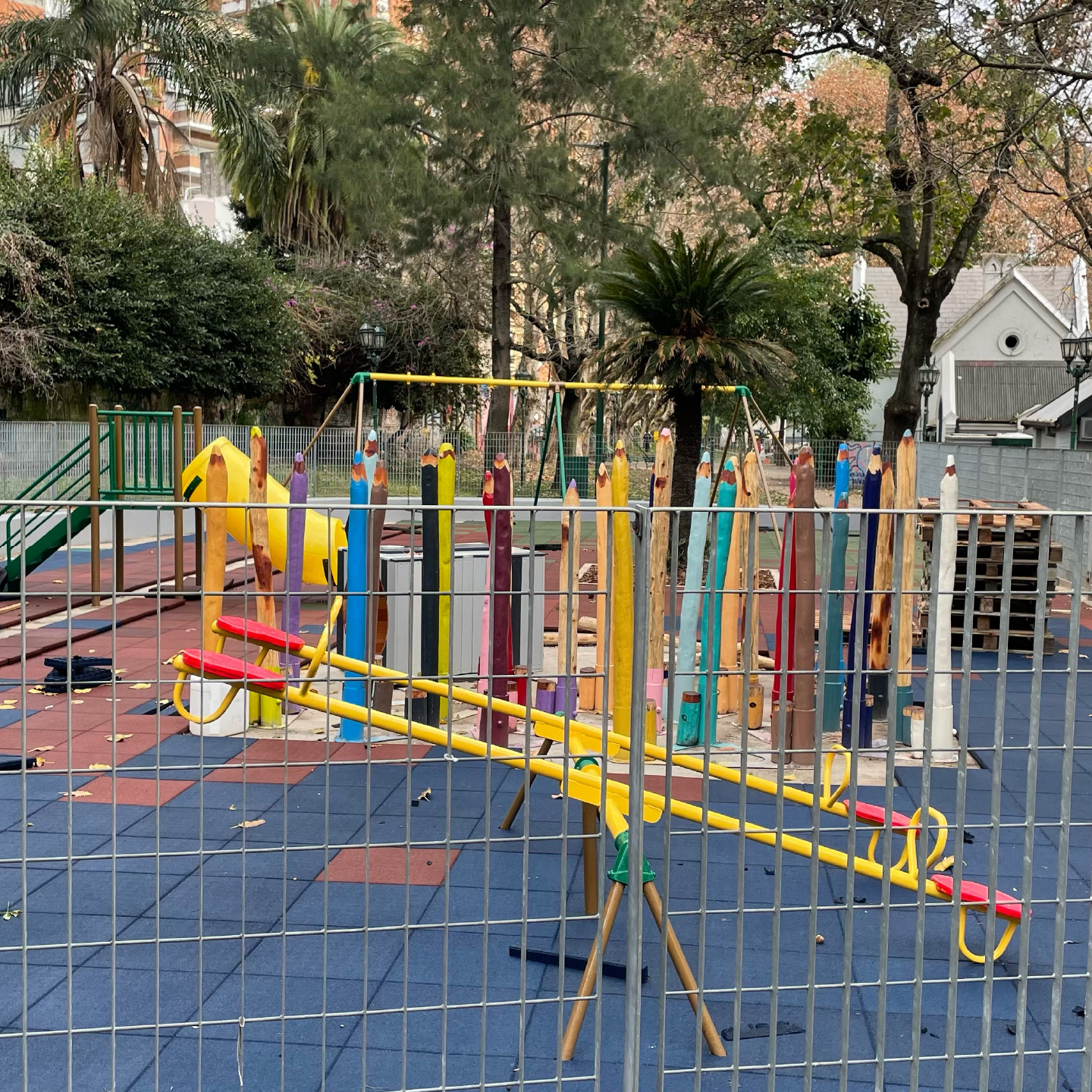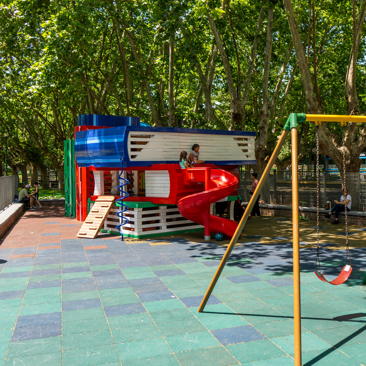 Junto al equipo de Comuna 12 y Nupa Playgrounds, se diseñó un mangrullo escultórico en forma de torre de libros, que invita a trepar, explorar y jugar entre historias. Se recuperaron y reacondicionaron los juegos existentes —como el pórtico de hamacas— bajo un criterio de sustentabilidad y reutilización de estructuras en buen estado. Todo el conjunto se unifica mediante un piso de caucho amortiguante, que garantiza seguridad y continuidad visual entre las distintas áreas de juego.