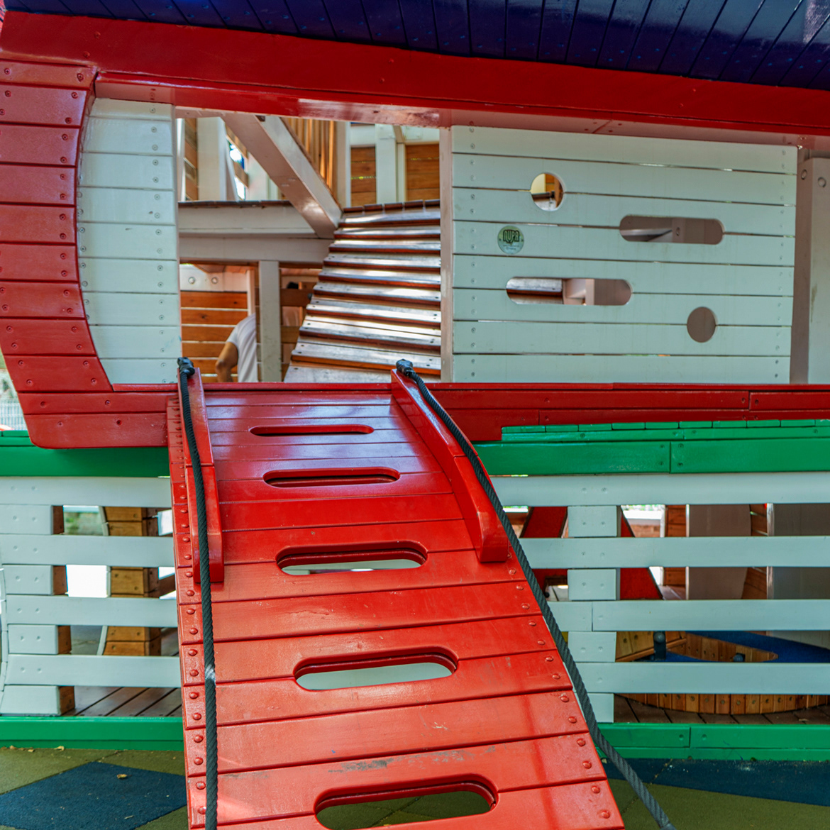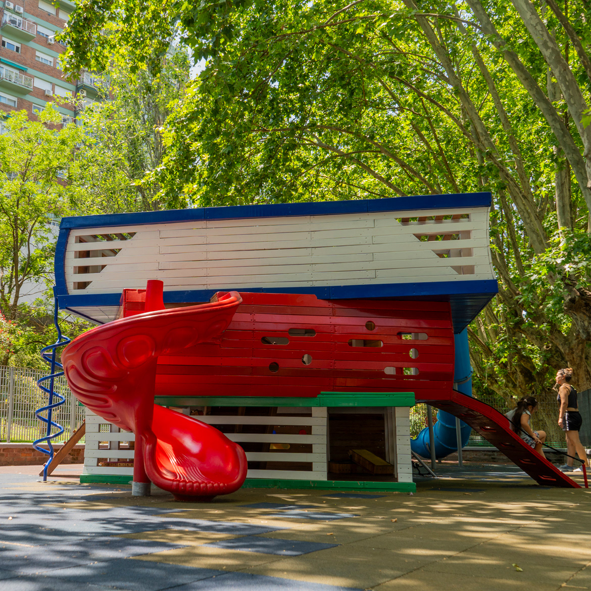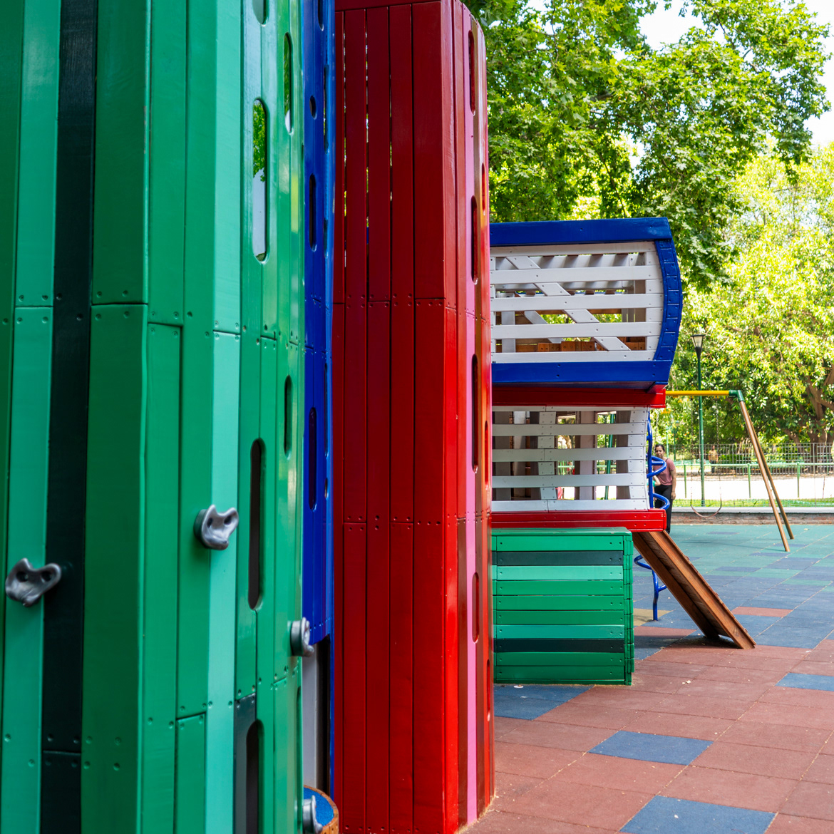 Junto al equipo de Comuna 12 y Nupa Playgrounds, se diseñó un mangrullo escultórico en forma de torre de libros, que invita a trepar, explorar y jugar entre historias. Se recuperaron y reacondicionaron los juegos existentes —como el pórtico de hamacas— bajo un criterio de sustentabilidad y reutilización de estructuras en buen estado. Todo el conjunto se unifica mediante un piso de caucho amortiguante, que garantiza seguridad y continuidad visual entre las distintas áreas de juego.
