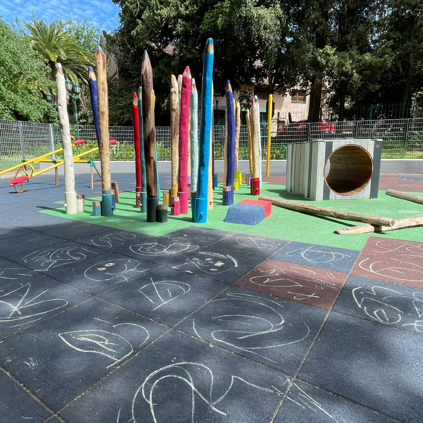 Junto al equipo de la Comuna 12 y Nupa Playgrounds, se desarrollo un mangrullo escultórico en forma de bosque de lápices de colores, acompañado por un sacapuntas y una goma de borrar que estimulan el juego simbólico y la imaginación. Se conservaron los juegos existentes en buen estado, restaurándolos bajo criterios de sustentabilidad y aprovechamiento de recursos, y se completó el conjunto con un piso de caucho amortiguante para garantizar seguridad durante el juego.