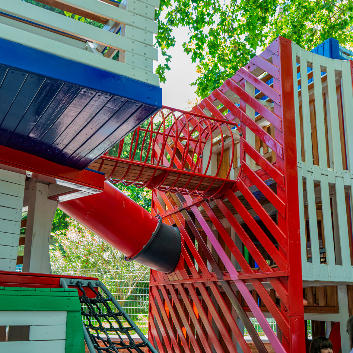 El patio de juegos para chicos y chicas de más de cuatro años toma como punto de partida la presencia de la biblioteca vecinal de la estación, integrando la lectura y la imaginación como ejes del diseño.