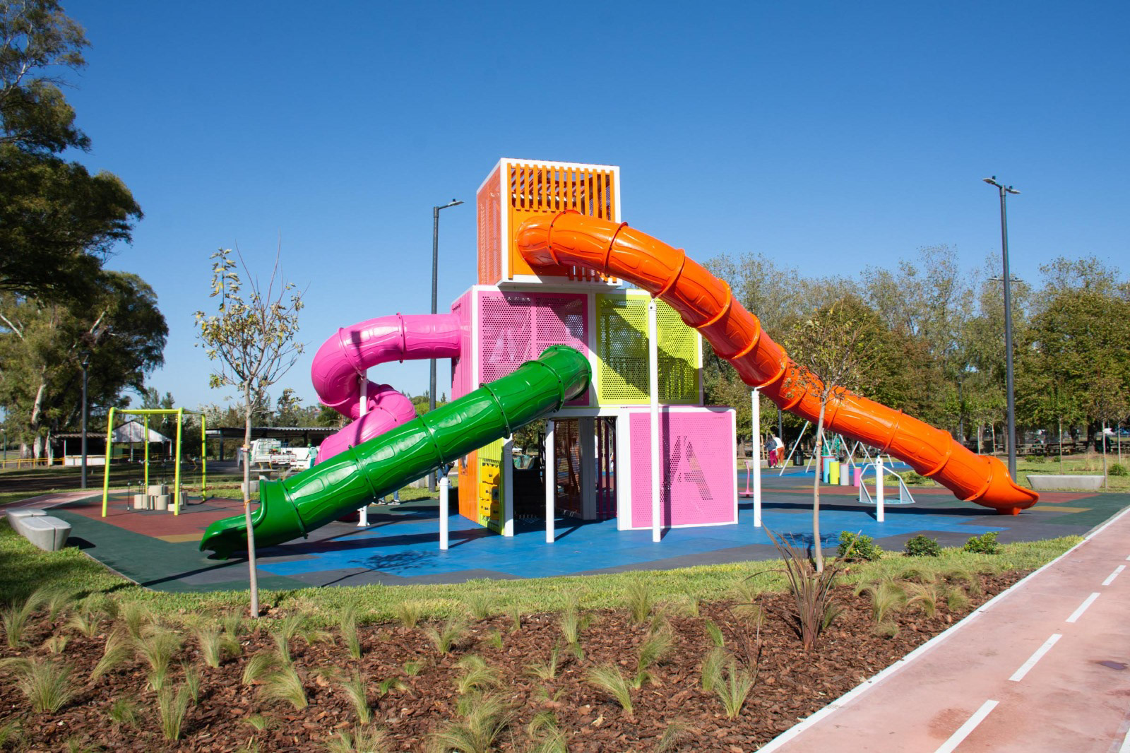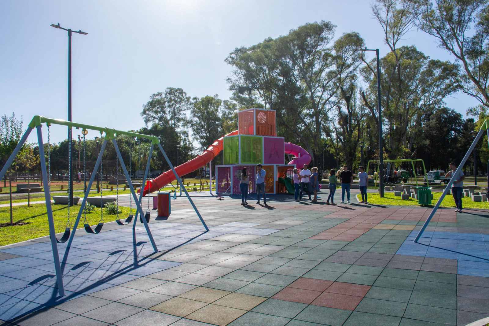 El proyecto, desarrollado junto a la Comuna 12 del Gobierno de la Ciudad de Buenos Aires, incorpora una pista perimetral de hormigón que permite recorrer todo el espacio de manera segura y continua. Los juegos, de la empresa Crucijuegos, incluyen un gran mangrullo como pieza central y un solado de baldosas de caucho que acompaña la geometría del diseño.