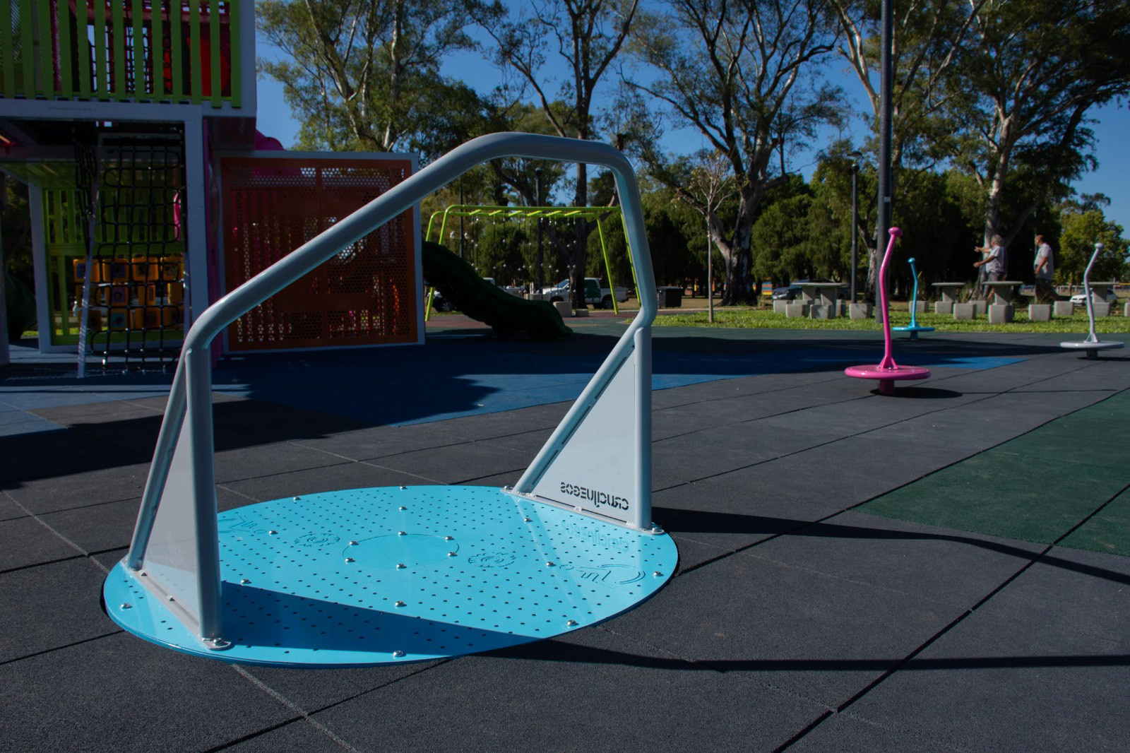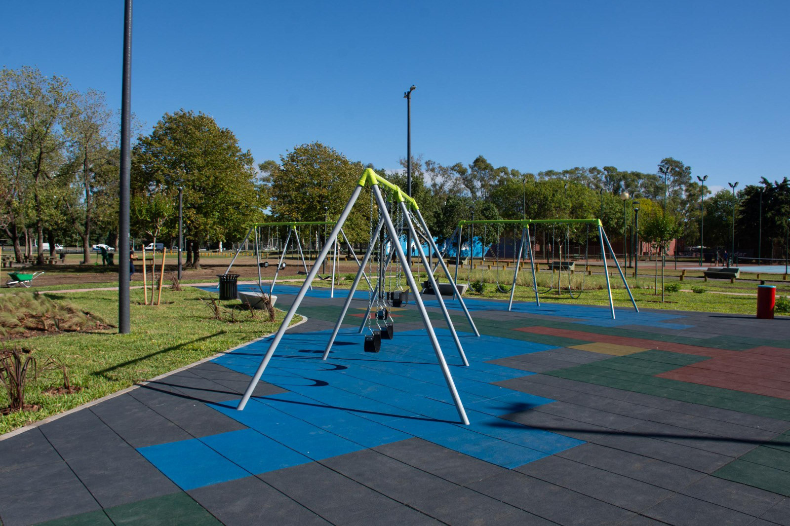 Dada la alta concurrencia del parque, se priorizó la instalación de una gran cantidad de hamacas — tres pórticos en total — junto con hamacas inclusivas, calesitas integradoras, juegos rotativos y musicales, todos pensados para que niños y niñas de distintas edades y capacidades puedan jugar juntos.