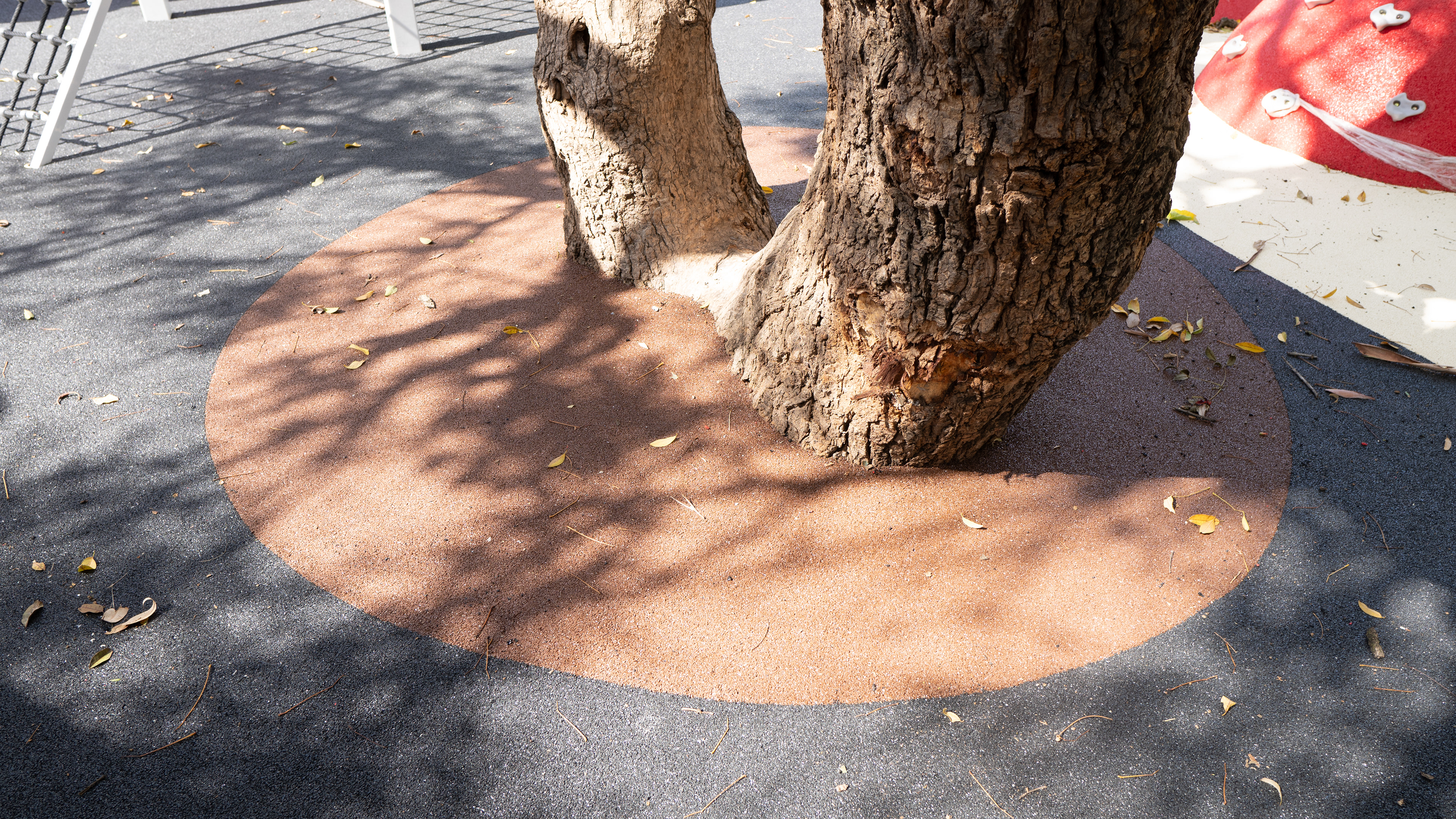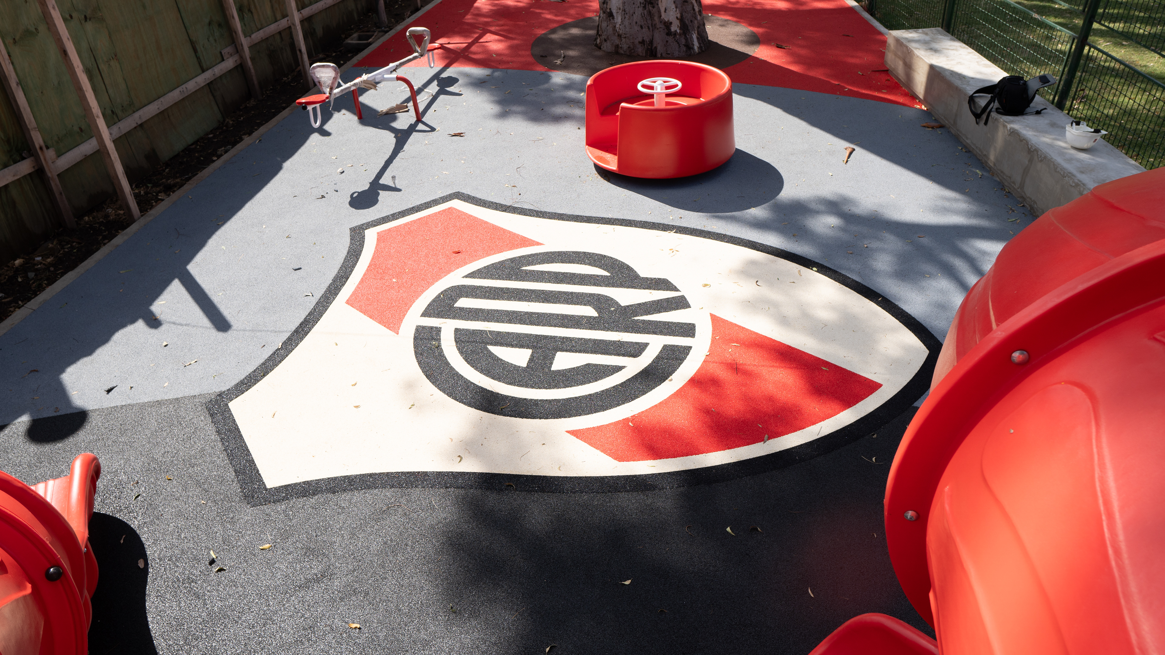 Uno de los mayores desafíos técnicos fue la ejecución del escudo de River Plate en caucho in situ, de 8 metros de alto, realizado con precisión milimétrica. El proyecto combina superficies de chip de madera y caucho continuo, aprovechando la sombra de los árboles añosos del predio: el chip define las zonas de estar de adultos, y el caucho, las áreas de juego seguro.