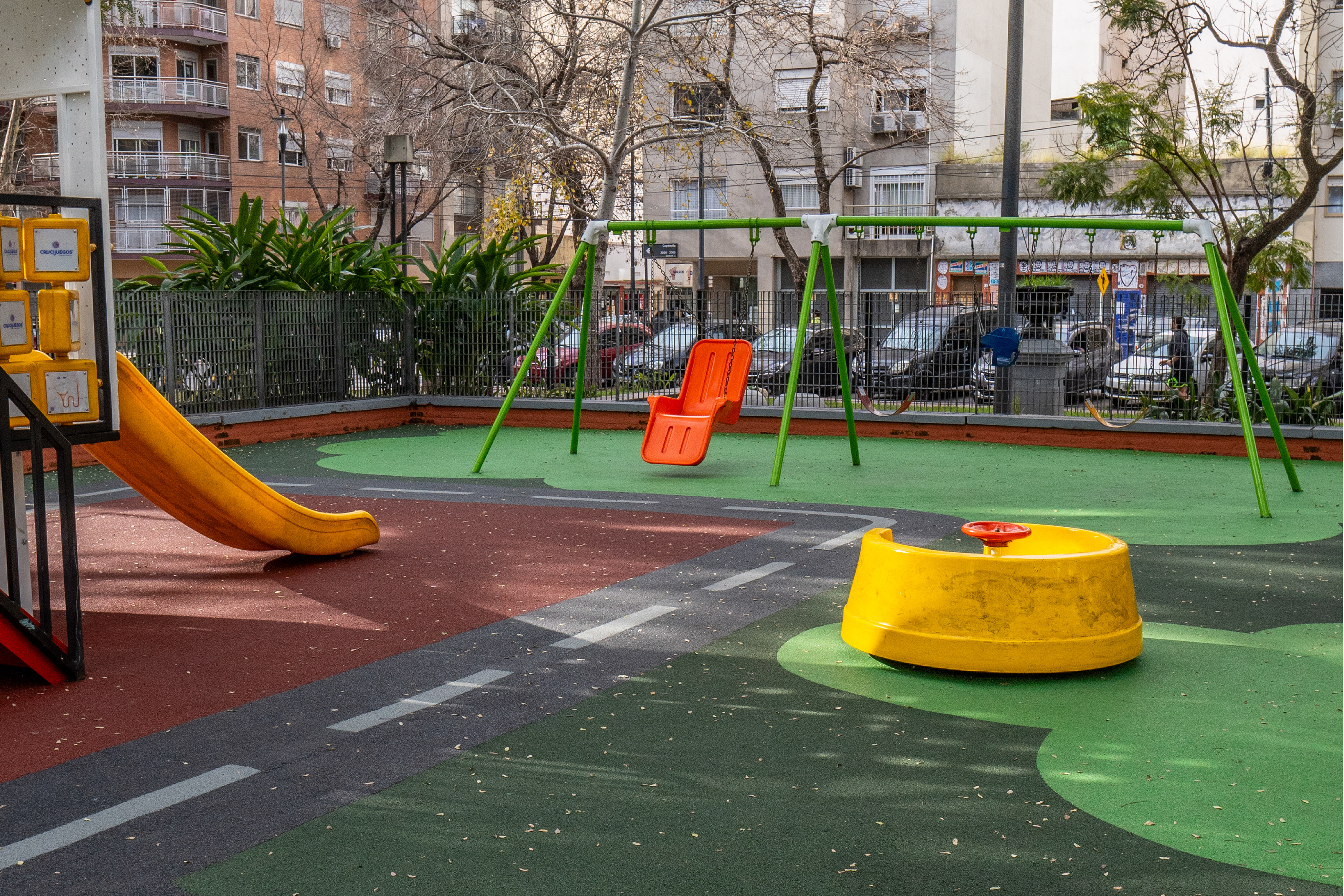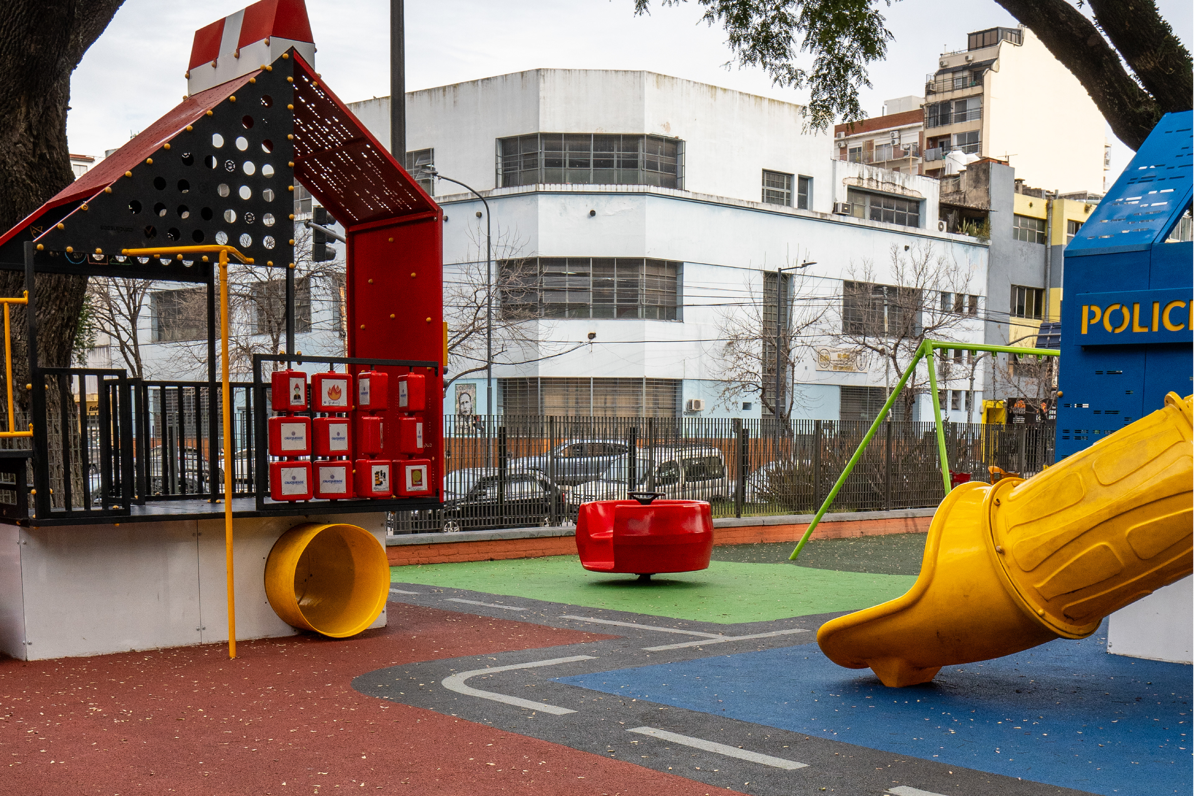 En la segunda etapa (2025) se ejecutó un solado de caucho continuo que conecta las distintas áreas del juego y refuerza la narrativa urbana del conjunto. De un lado se ubican el hospital, la policía y los bomberos, y del otro, los sectores recreativos. El nuevo diseño incorpora senderos de circulación que invitan a los chicos a aprender a andar en bicicleta, jugar con cochecitos, monopatines o desplazarse en silla de ruedas, promoviendo el aprendizaje vial desde la experiencia lúdica.