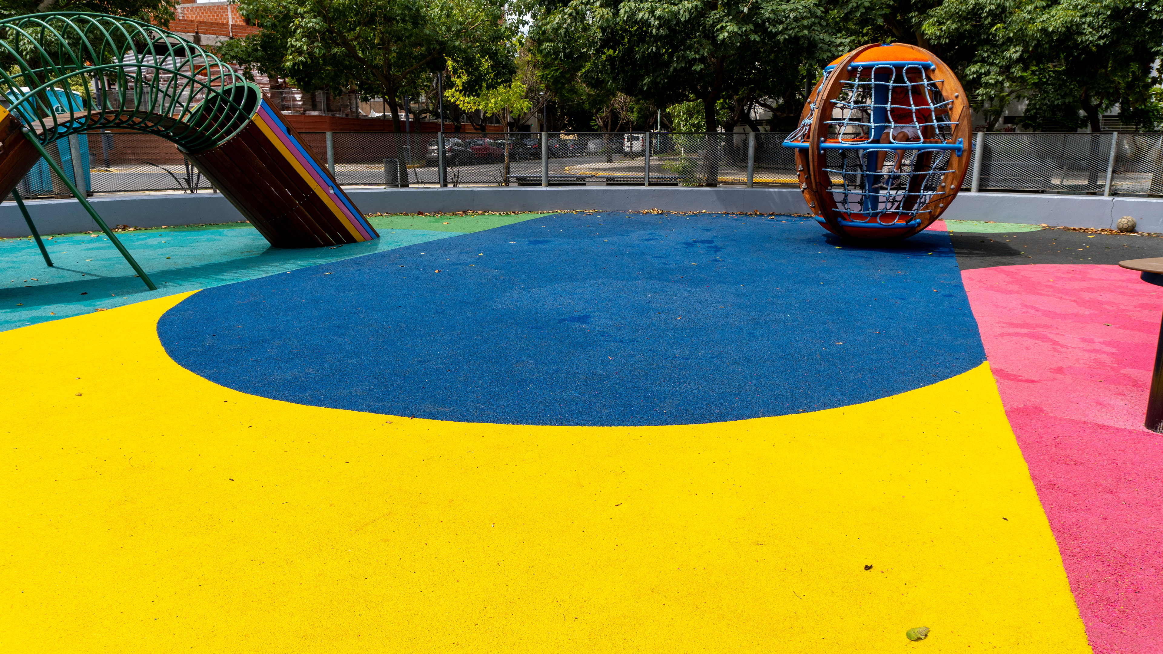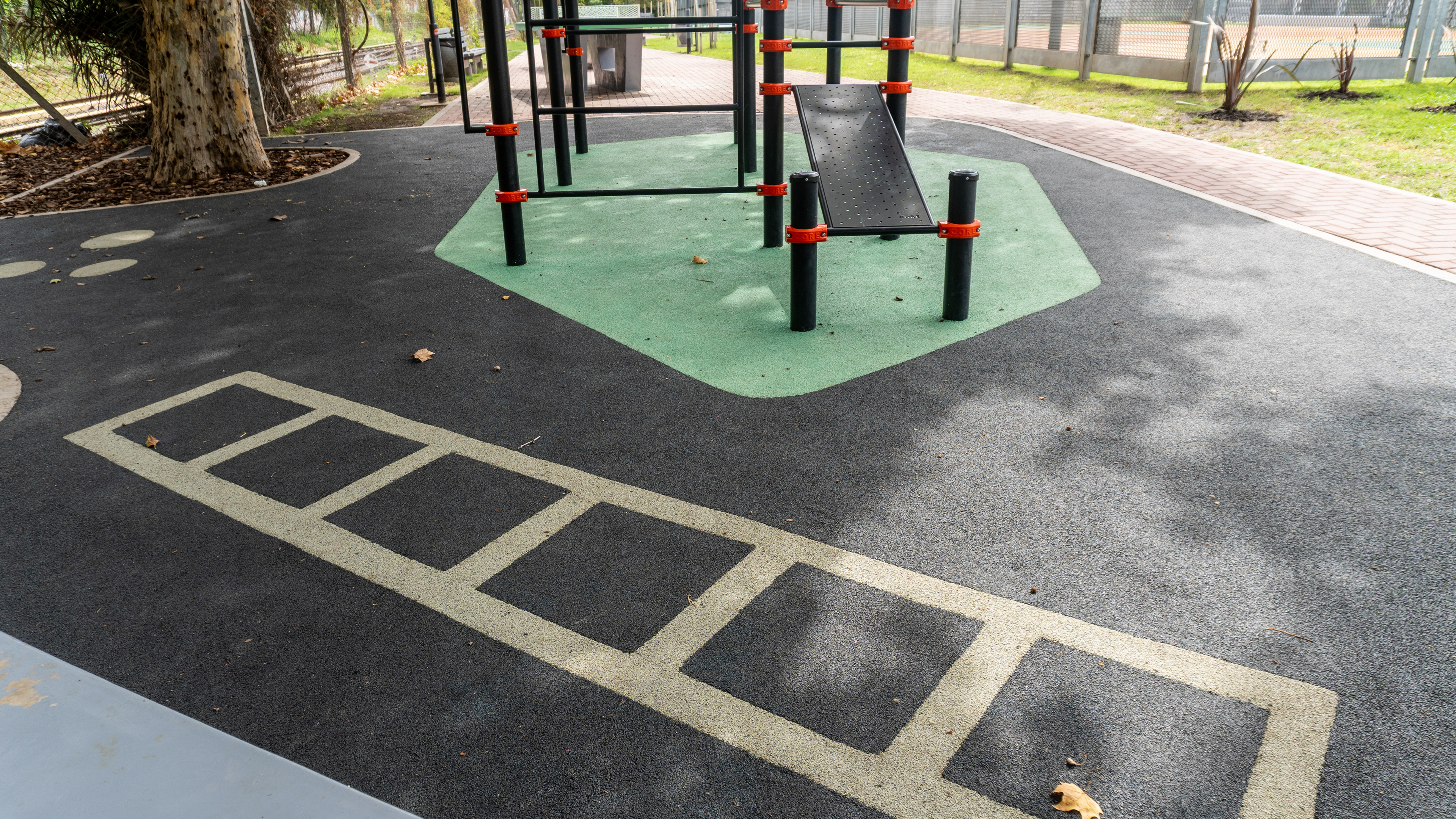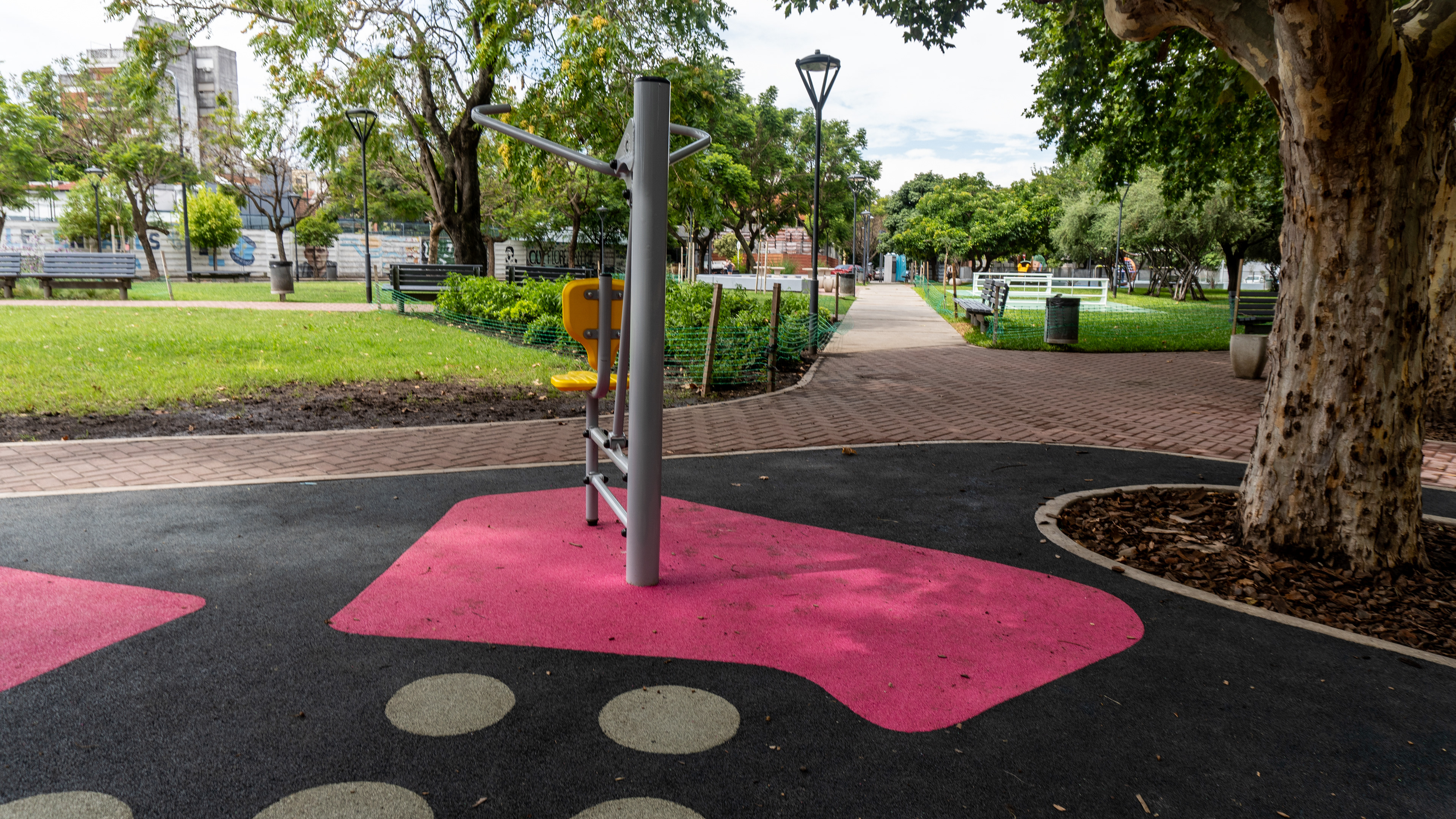 Se restauraron las dos canchas deportivas con un diseño de solado en pintura epoxi, y se incorporaron nuevos senderos de intertrabado rojo que conectan los diferentes sectores del parque. La intervención incluyó una estación de calistenia y una estación deportiva de bajo impacto, ambas con equipamiento de CORE, además de nuevos elementos deportivos de Crucijuegos.