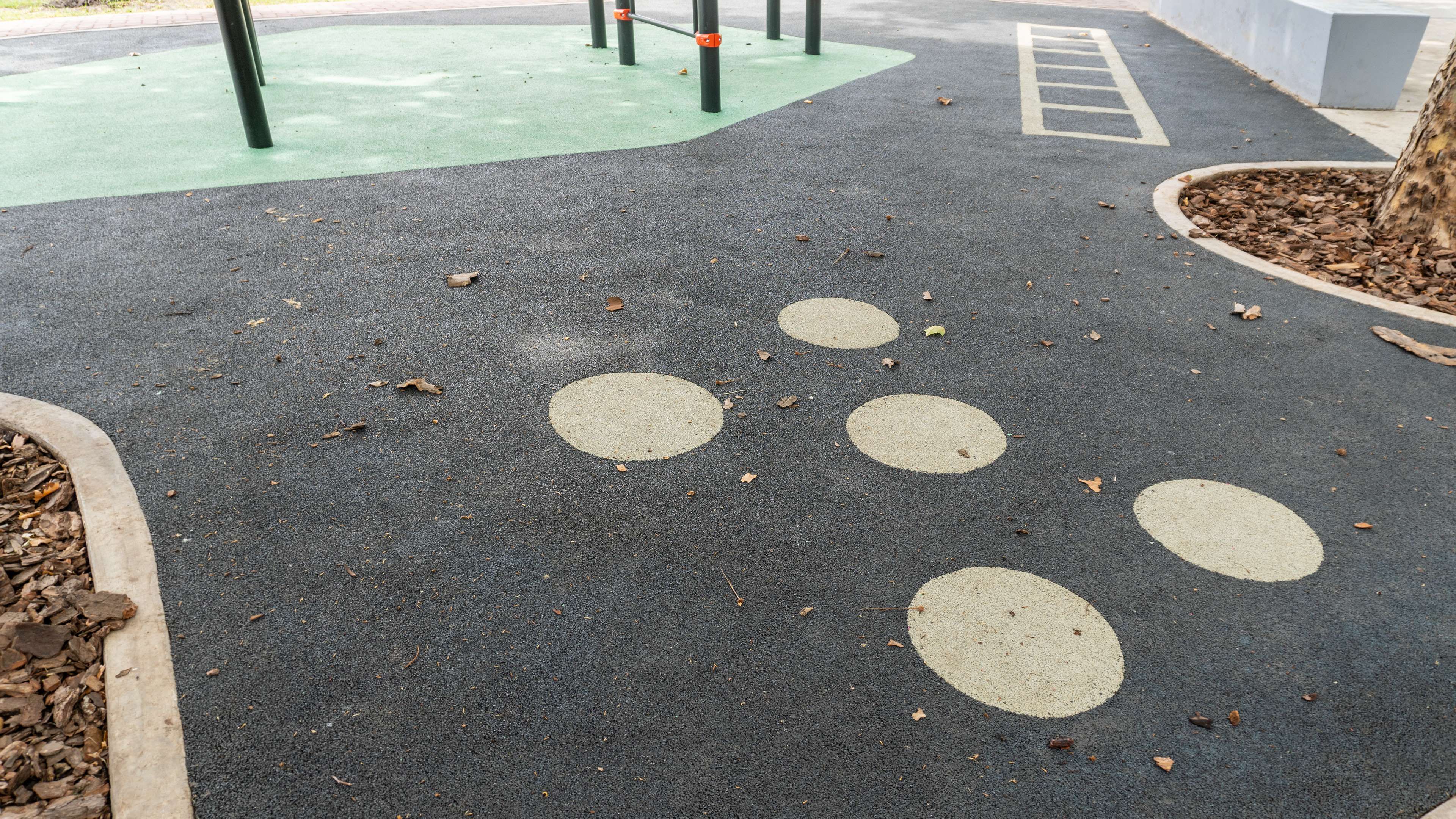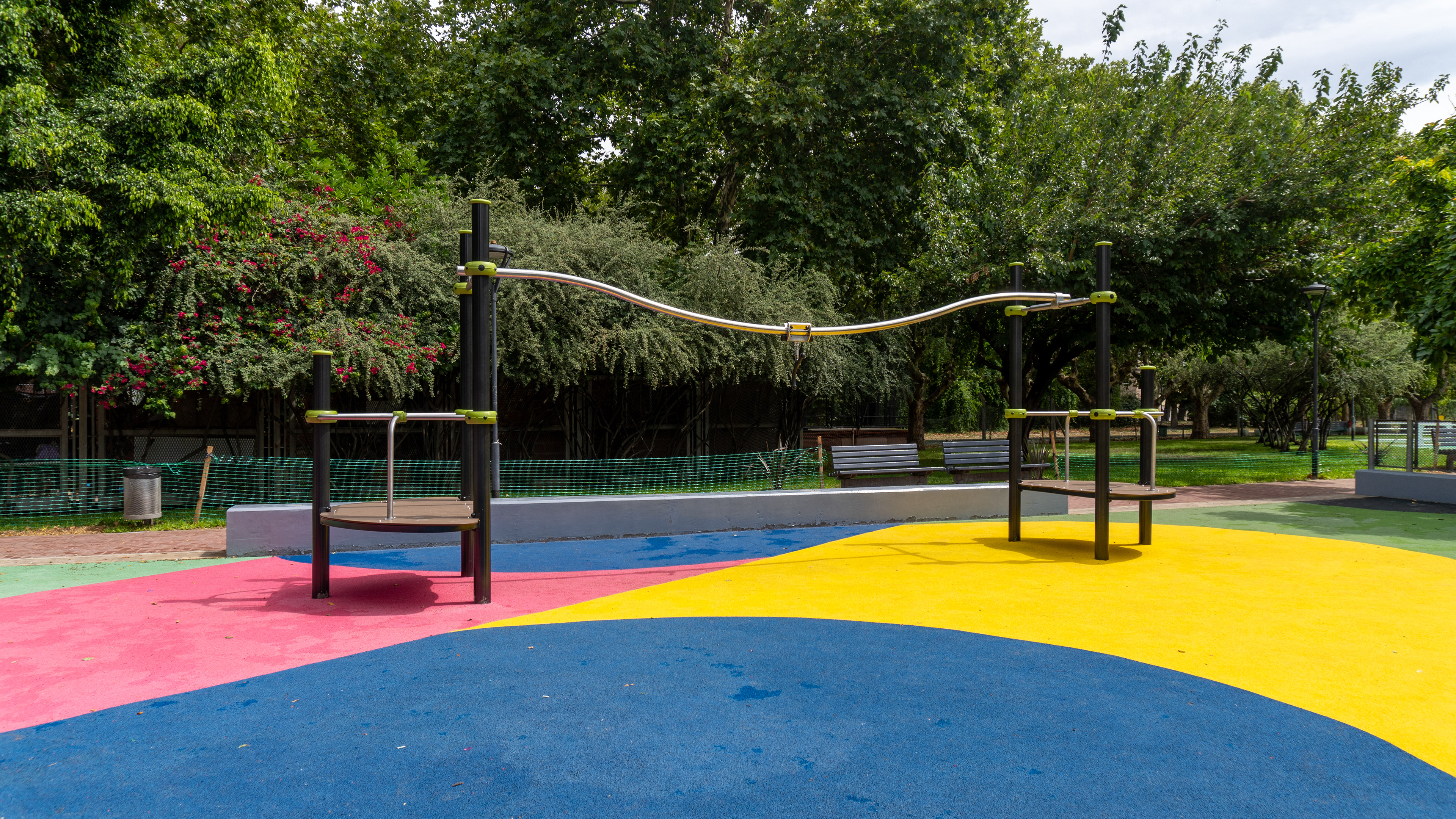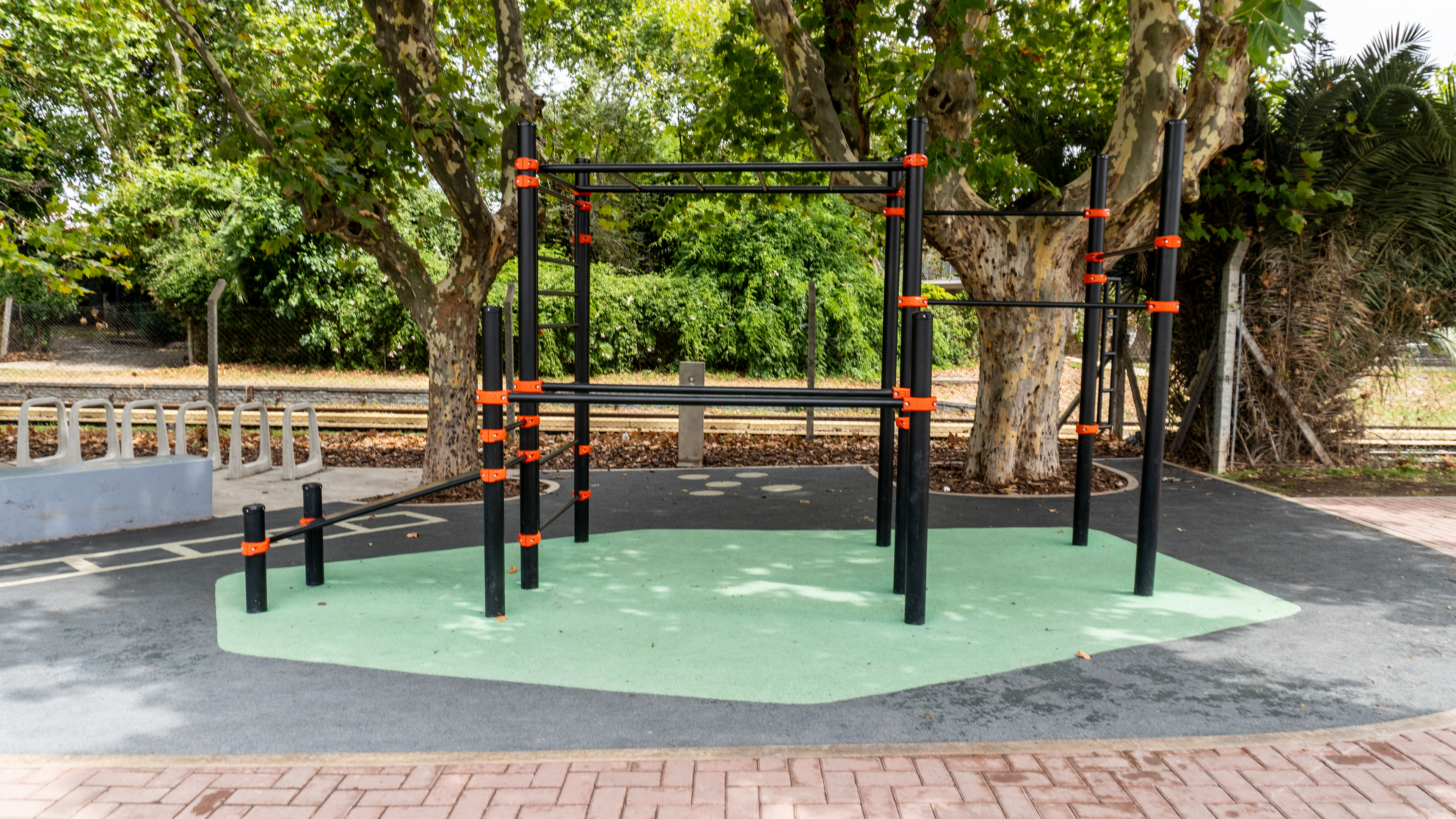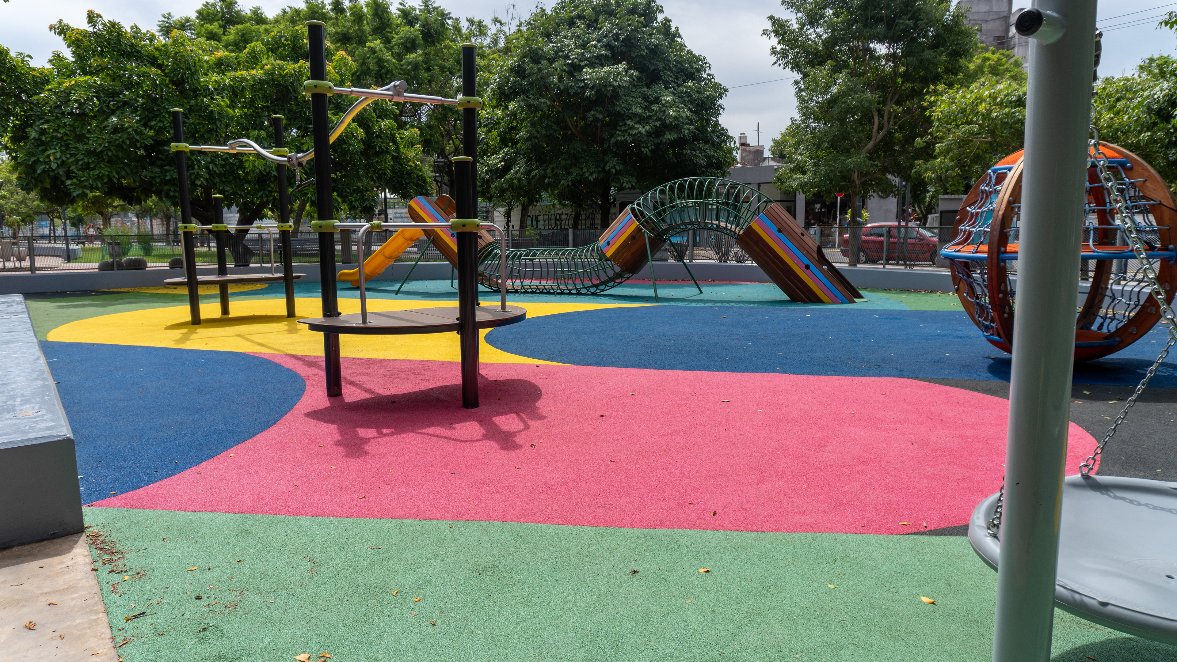 Se restauraron las dos canchas deportivas con un diseño de solado en pintura epoxi, y se incorporaron nuevos senderos de intertrabado rojo que conectan los diferentes sectores del parque. La intervención incluyó una estación de calistenia y una estación deportiva de bajo impacto, ambas con equipamiento de CORE, además de nuevos elementos deportivos de Crucijuegos.