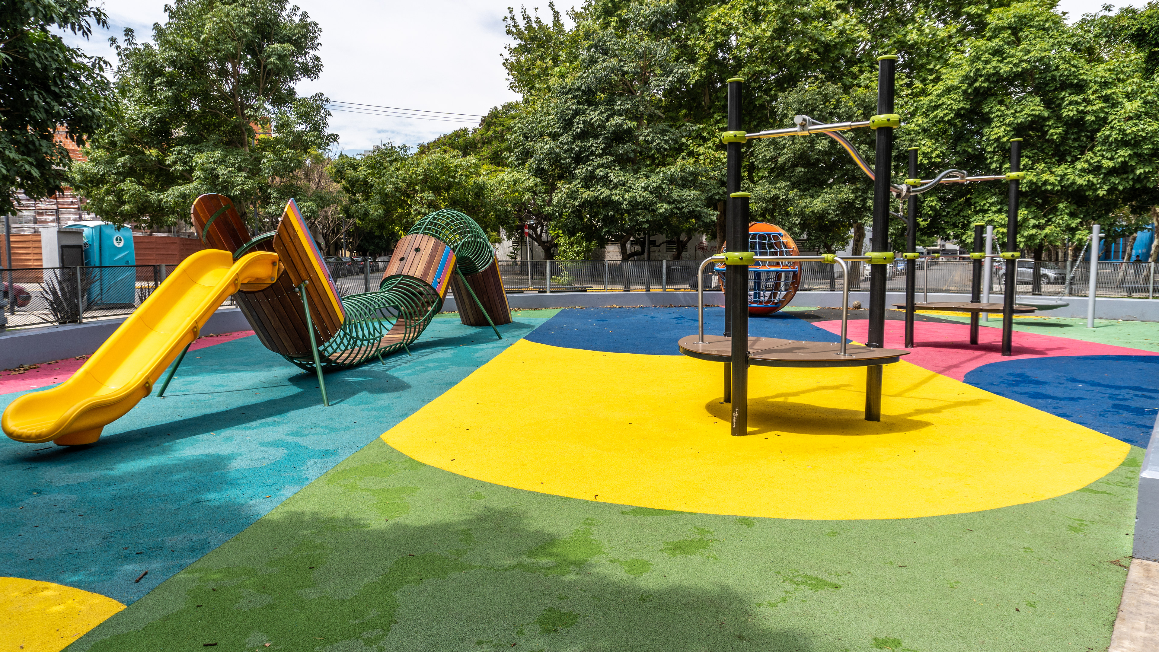 El principal desafío fue diseñar un patio compacto y diverso, con juegos para distintas edades y niveles de accesibilidad, que hoy se consolida como uno de los espacios más usados y representativos del nuevo parque.